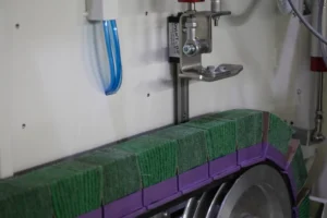 Two cross belts mounted with abrasive blocks run in opposite directions, completing edge rounding on the complete area of the part.